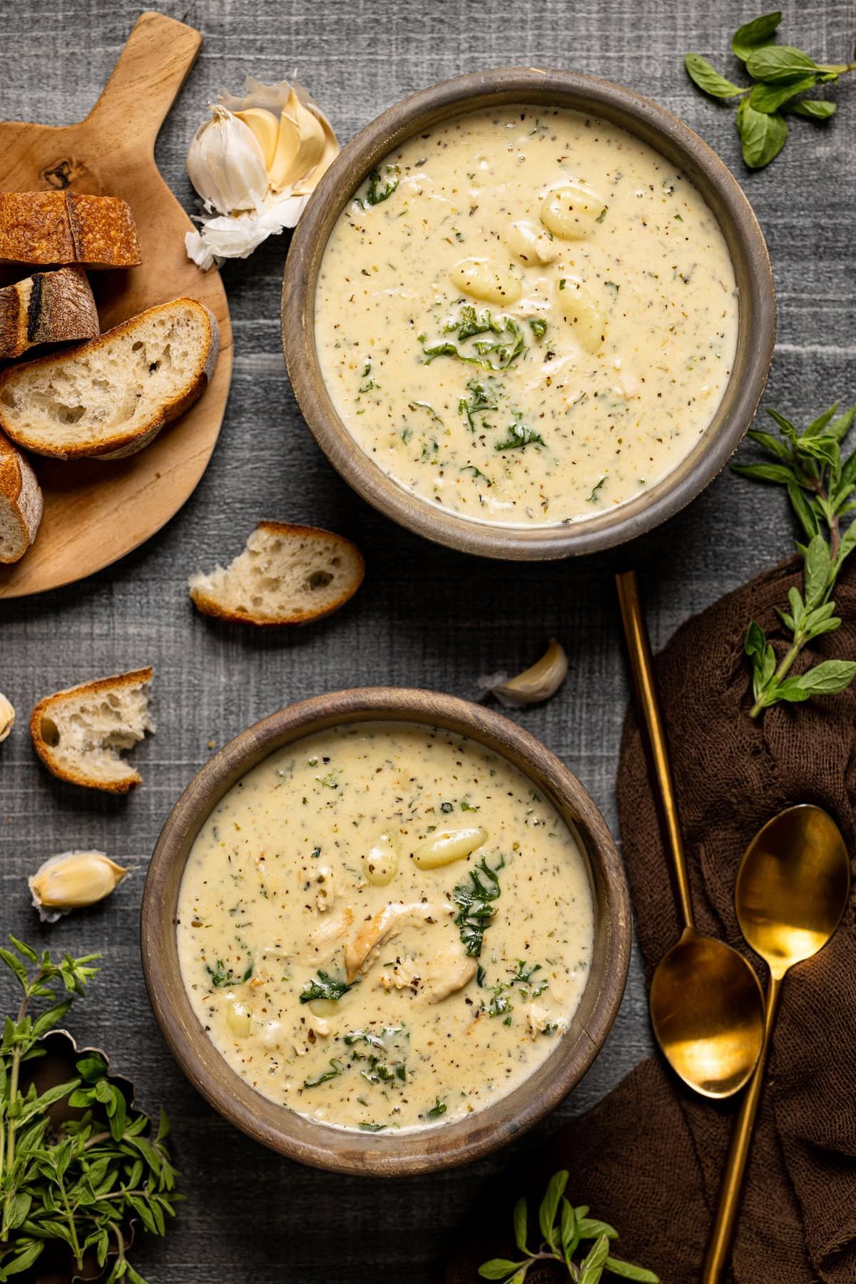 Creamy mushroom soup served with garlic bread